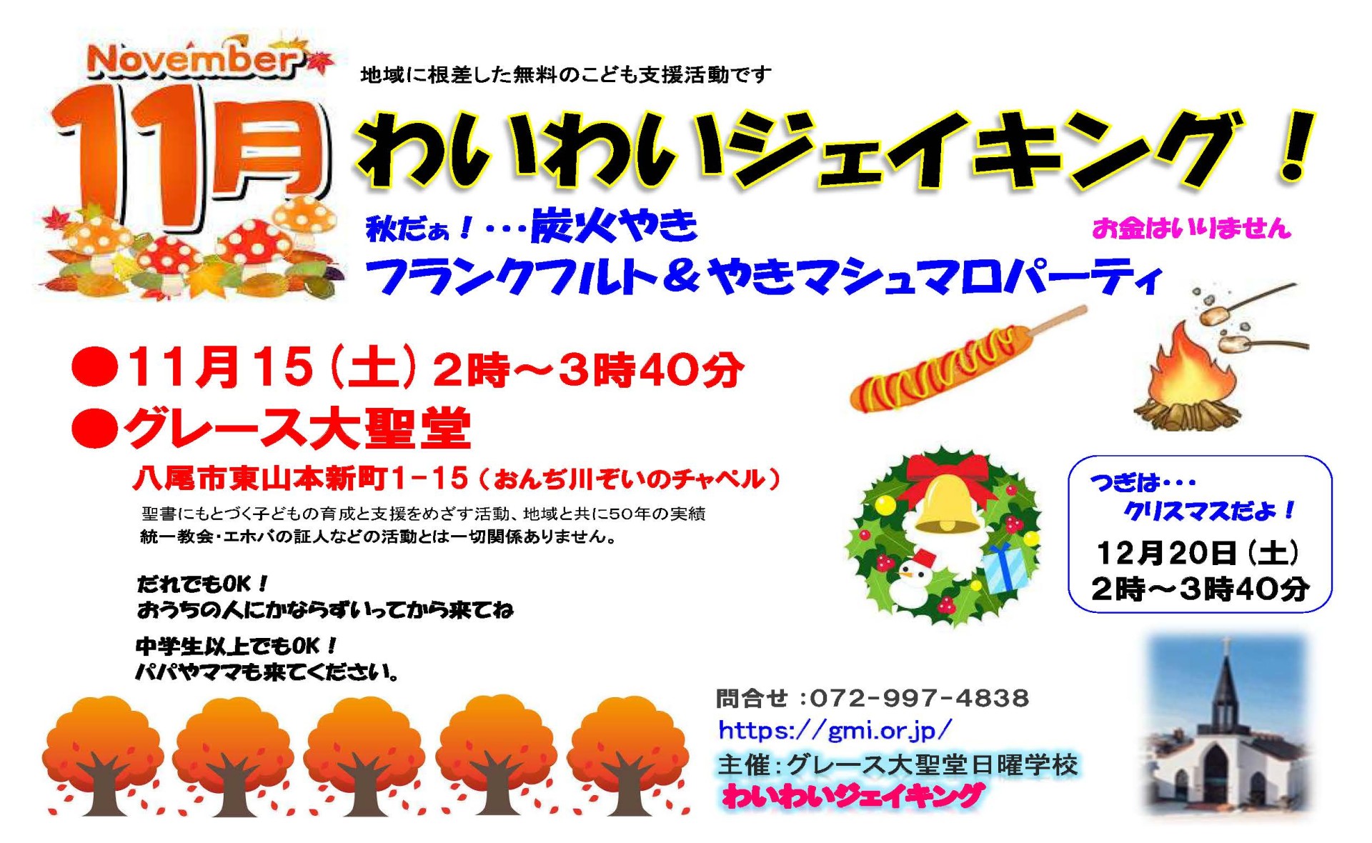 11月のわいわいジェイキングは「炭火やきフランクフルト&やきマシュマロパーティ」♪