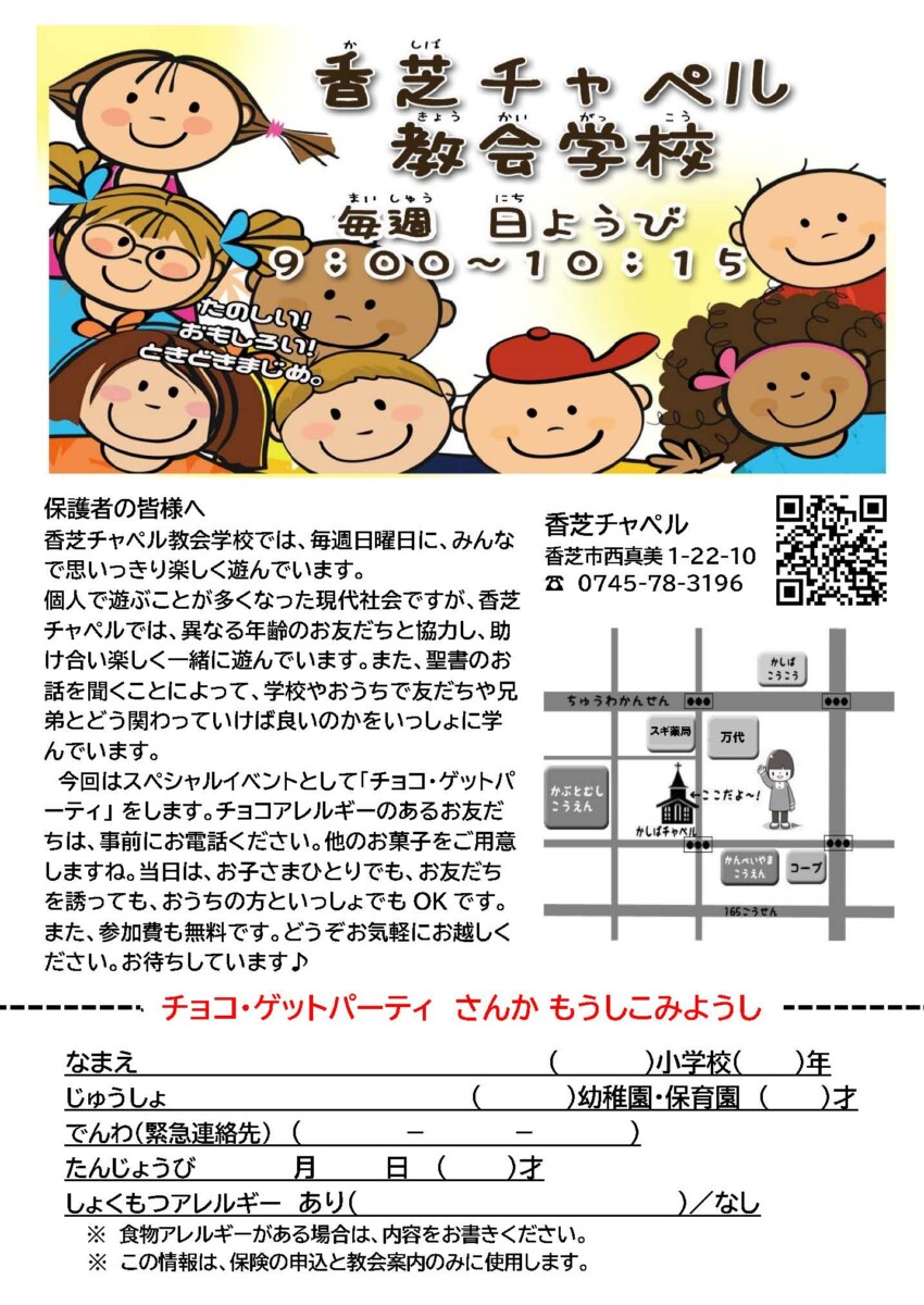 【無料イベント】チョコ・ゲットパーティ♪2026【奈良・香芝・かしばチャペル】 2026/01/19 みんなで かしばチャペル にあそびにいこう!! ナーフ♪ボウリング♪ガラガラちゅうせん♪わなげ♪ などなど... チャレンジして チョコやおかしをゲットしよう!! さんかひはむりょうだよ♪ きょうだいやともだち、パパやママもさそってみんなであそびにきてね! もちろんひとりでのさんかもだいかんげい!! 【日時】 2/8(日) 14:00 〜 15:30 【場所】 かしばチャペル 【参加費】 むりょう ▲クリックで画像の拡大・ダウンロードが可能です。