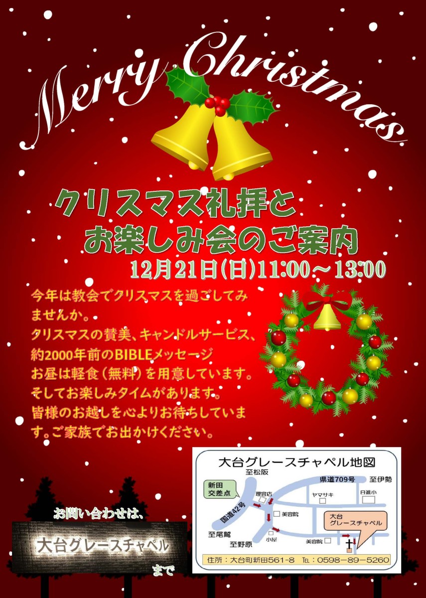 大台グレースチャペル クリスマス礼拝とお楽しみ会のご案内【三重県・大台町・大台グレースチャペル・キリスト教会】 2025/12/02 どなたでも大歓迎です♪クリスマスを教会で過ごしませんか♪ クリスマスの賛美、キャンドルサービス、約2000年前のBIBLEメッセージ お昼は軽食(無料)を用意しています。 そしてお楽しみタイムがあります。 みなさまのお越しを心よりお待ちしています。 ご家族でお出かけください。 【日時】 12月21日(日) 11時 〜 13時 【場所】 大台グレースチャペル 大台町新田561-8 ▲クリックで画像の拡大・ダウンロードが可能です。