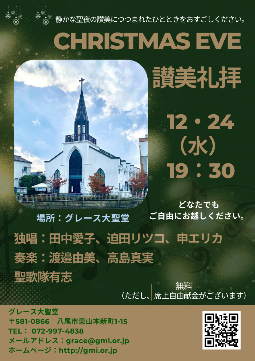 2025年クリスマスイヴ賛美礼拝「静かな聖夜の賛美につつまれたひとときをおすごしください」【大阪府・八尾市・グレース大聖堂・キリスト教】 2025/11/22 どなたでも大歓迎です♪イヴを教会で過ごしませんか♪ 皆さまのお越しをお待ちしております。 独唱:田中愛子、迫田リツコ、申エリカ 奏楽:渡邉由美、高島真実 聖歌隊有志 【日時】 12月24日(水) 19時30分 〜 【場所】 グレース大聖堂 ※当日席上自由献金がございます。 ▲クリックで画像の拡大・ダウンロードが可能です。