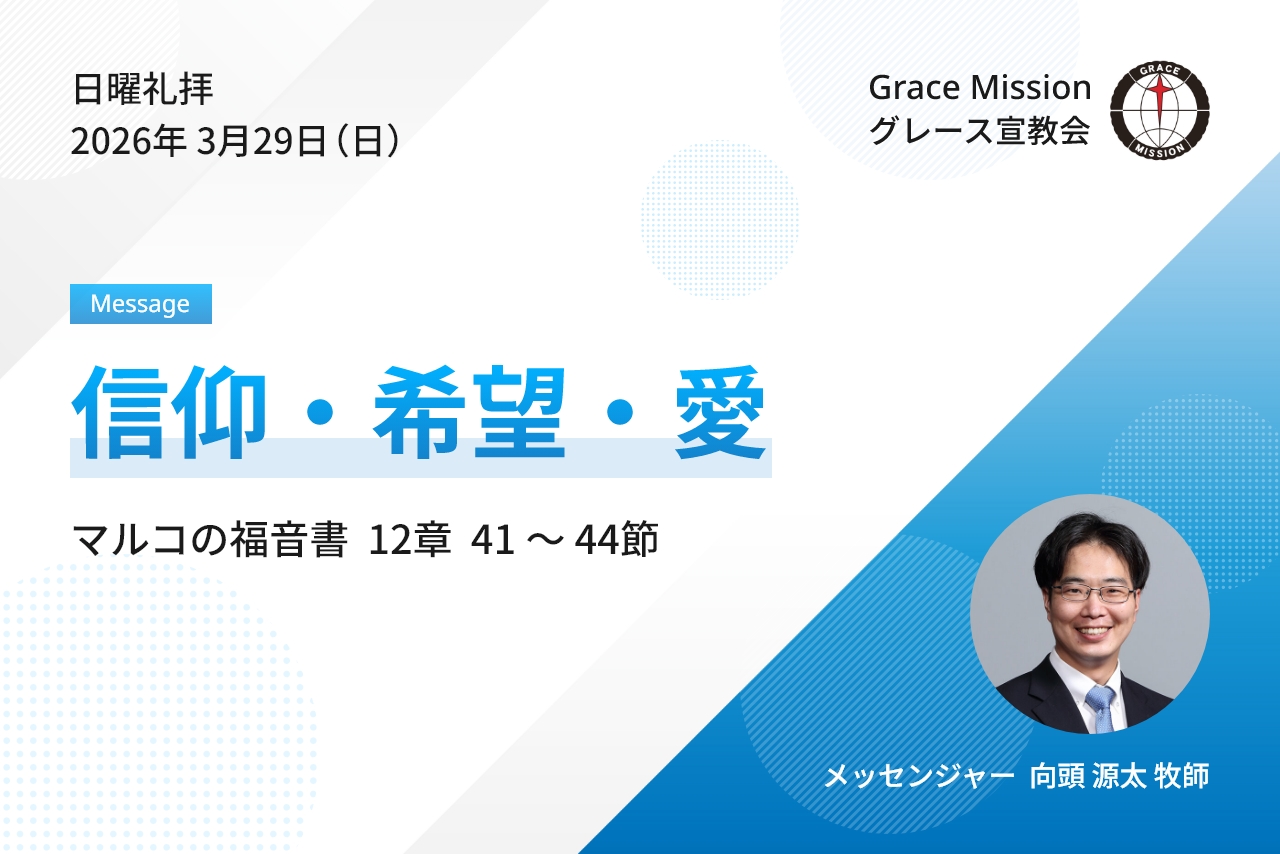 【日曜礼拝メッセージ】「信仰・希望・愛」マルコの福音書 12章 41 ~ 44節【大阪府・八尾市・グレース宣教会・キリスト教会】 2026/03/29 【日曜礼拝概要】 聖書箇所:マルコの福音書 12章 41 ~ 44節 タイトル:「信仰・希望・愛」 説教者:向頭 源太 牧師