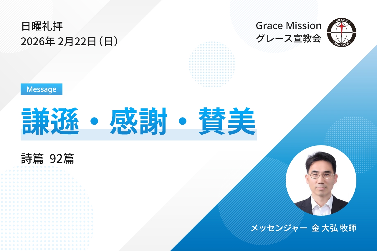 【日曜礼拝メッセージ】「謙遜・感謝・賛美」詩篇 92篇【大阪府・八尾市・グレース宣教会・キリスト教会】 2026/02/22 【日曜礼拝概要】 聖書箇所:詩篇 92篇 タイトル:「謙遜・感謝・賛美」 説教者:金 大弘 牧師