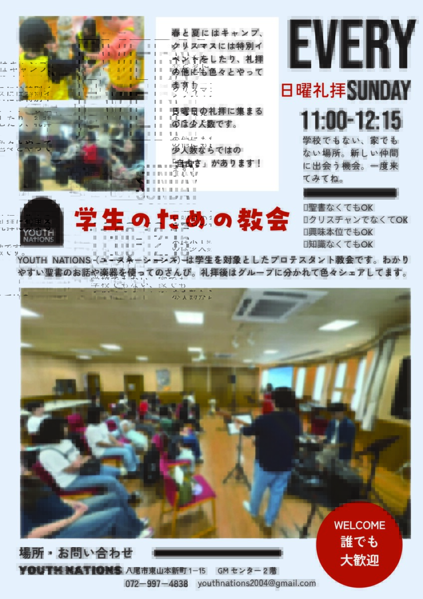 YOUTH NATIONS(ユースネーションズ)は学生を対象としたプロテスタント教会です。