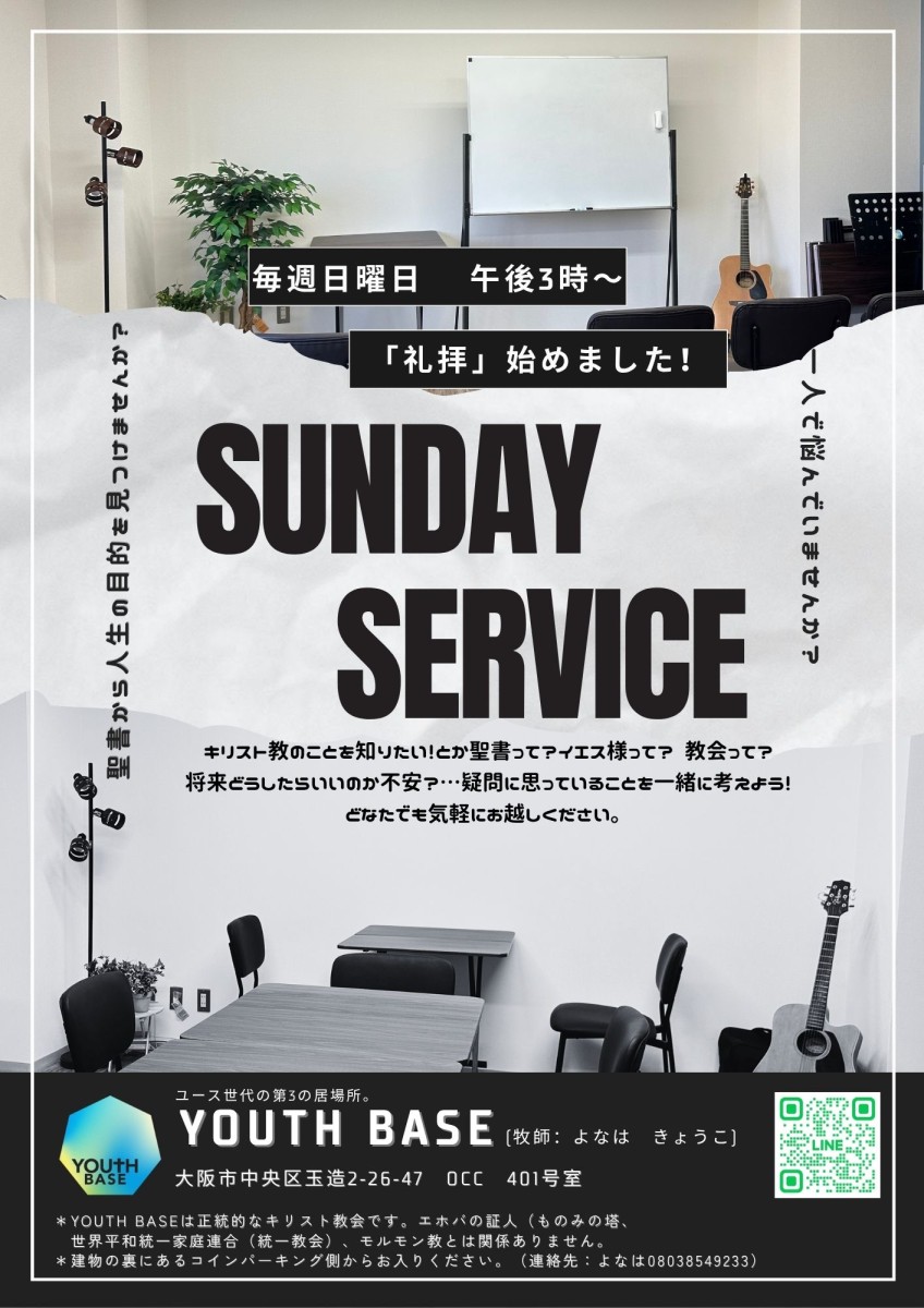 YOUTH BASE - SUNDAY SERVICE「礼拝」始めました!【大阪府・大阪市・Youth Nations・キリスト教】 2025/10/07 聖書から人生の目的を見つけませんか? キリスト教のことを知りたい!とか 聖書って?イエス様って?教会って? 将来どうしたらいいのか不安? 疑問に思っていることを一緒に考えよう! どなたでも気軽にお越しください。 日時:毎週日曜日 午後3時〜 場所:YOUTH BASE 大阪市中央区玉造2-26-47 OCC 401号室 ▲クリックで画像の拡大・ダウンロードが可能です。